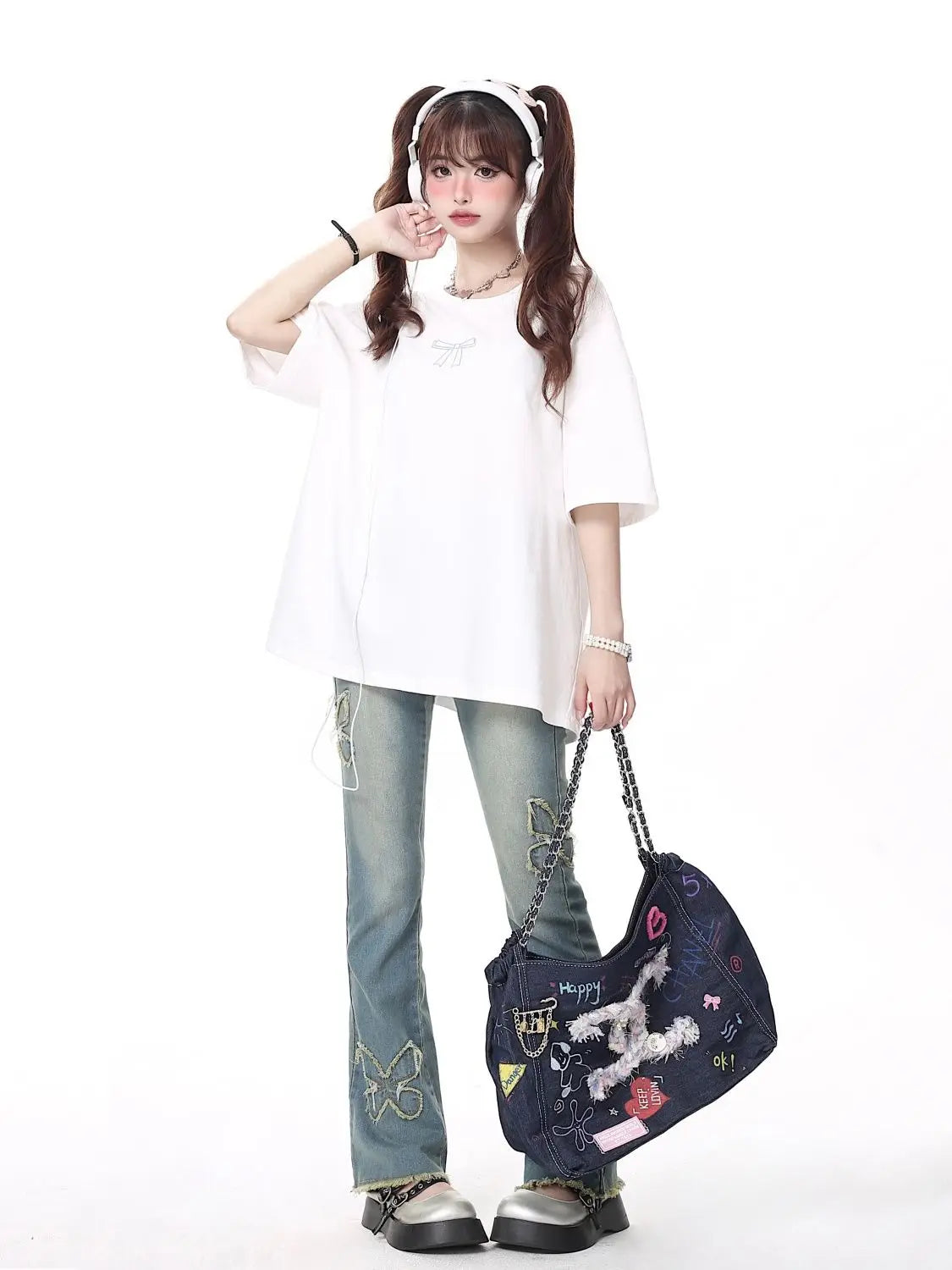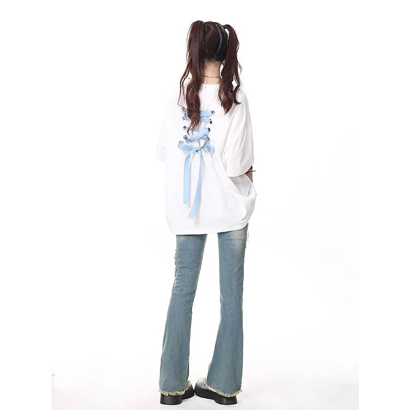 Biela rocková mikina so šnurovaním na chrbte a modrou mašľou
