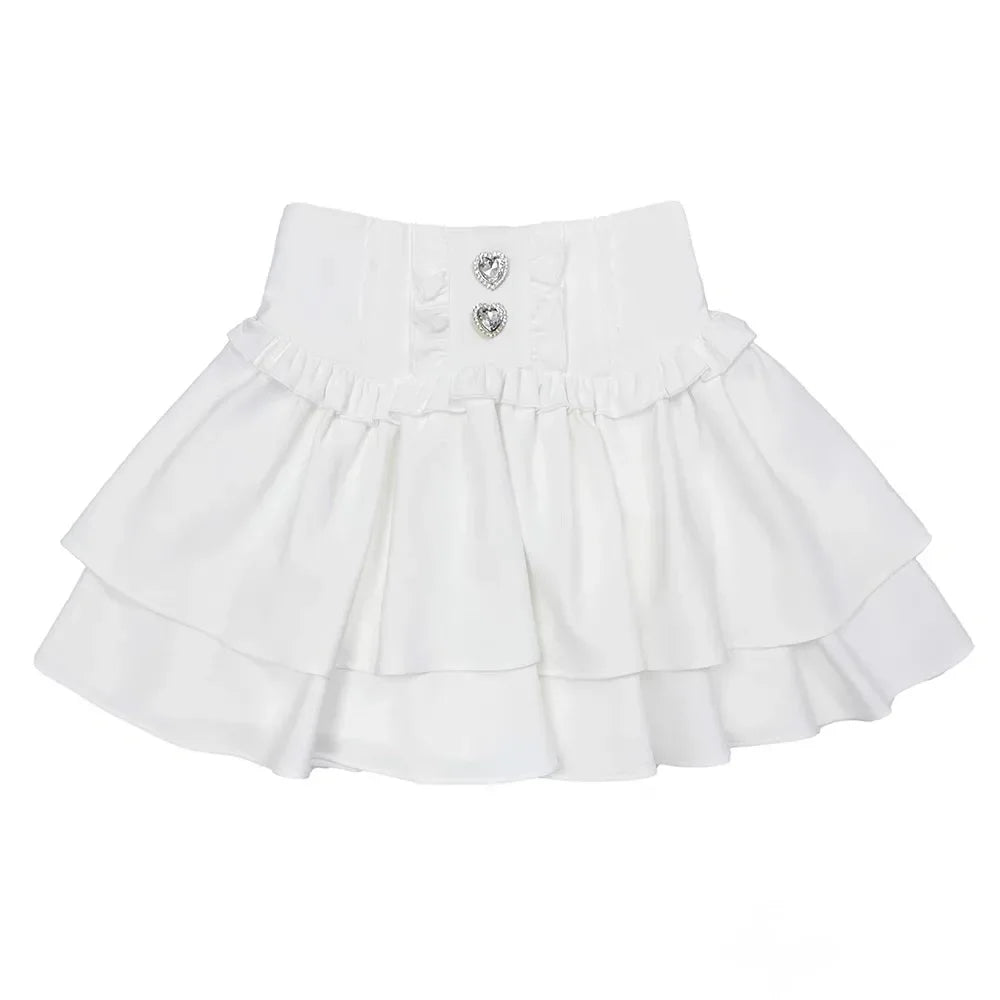 Biela sukňa Jirai Kei s volánmi a gombíkmi v tvare srdca