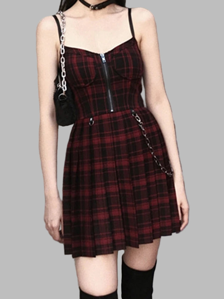Bordové grunge punk šaty s károvaným vzorom a retiazkou