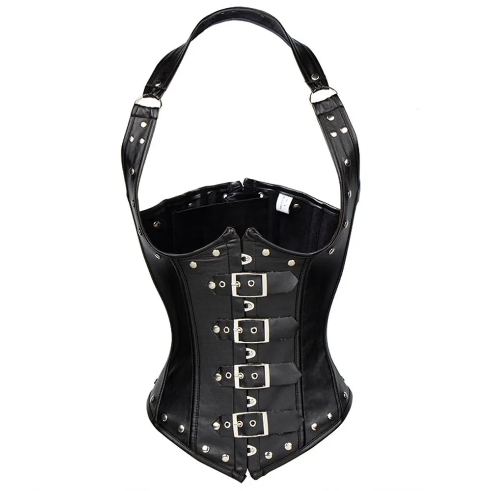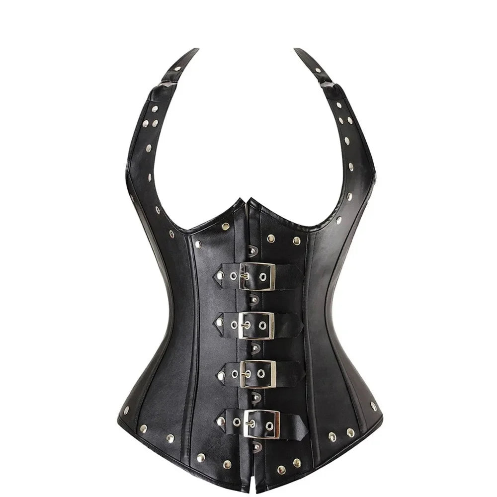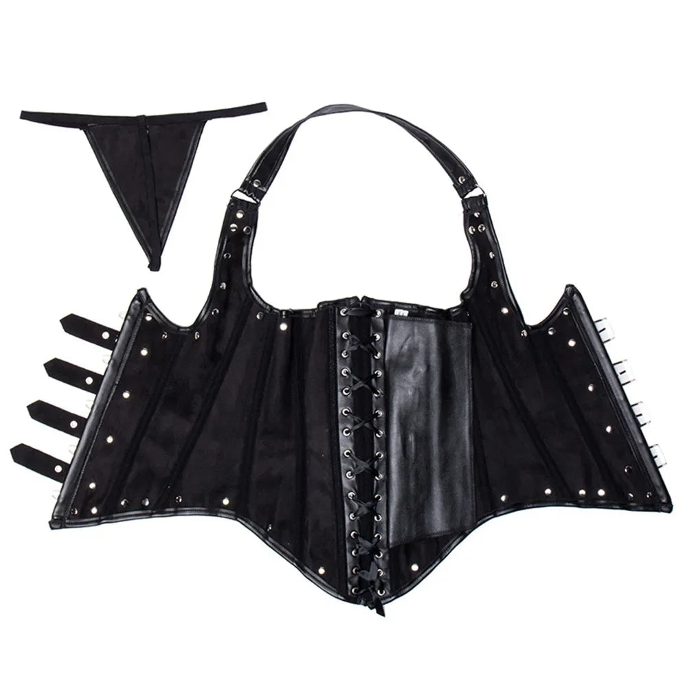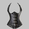 Dámsky červený korzet z ekokože s prackami – punk rock štýl