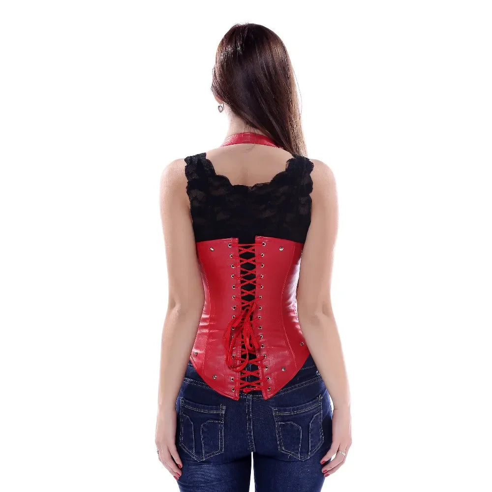Červený dámsky korzet z ekokože s prackami – punk rock štýl