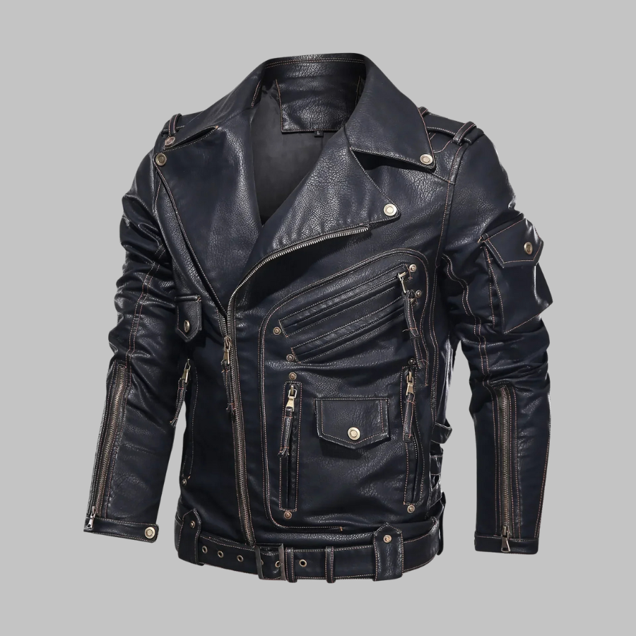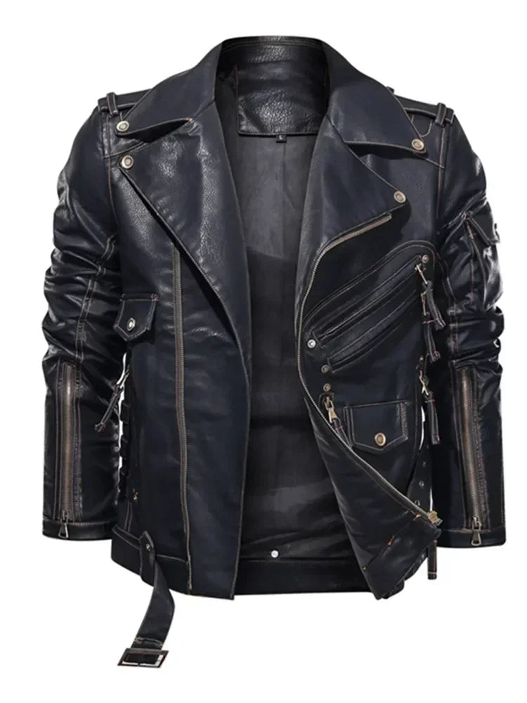 Čierna pánska motocyklová bunda z umelej kože v rockovom štýle