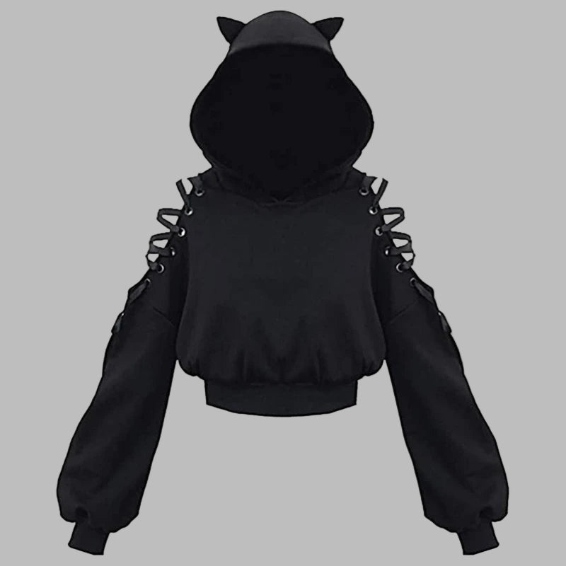 Čierna punk mikina s rohmi a šnurovaním na ramenách