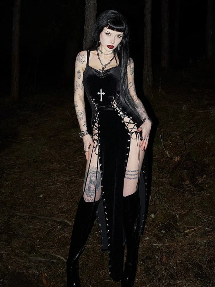 Čierne šaty s rozparkom v grunge punk štýle s krížom a sieťkou