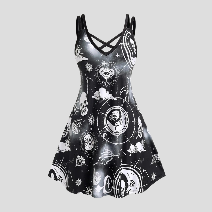 Čierne punk rock šaty s okultnými symbolmi a hviezdami