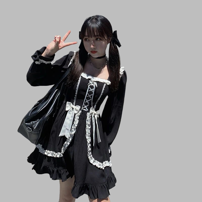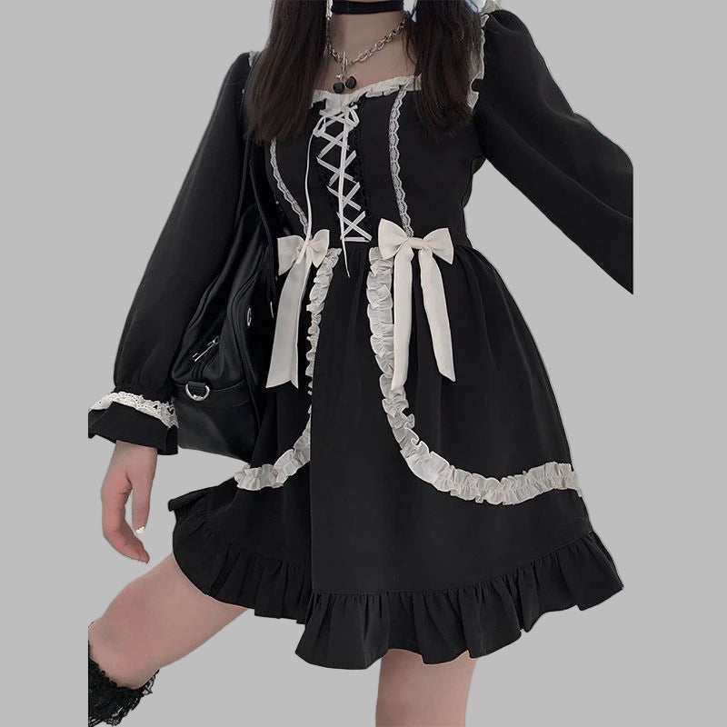 Čierne šaty Jirai Kei s bielymi mašľami a šnurovaním