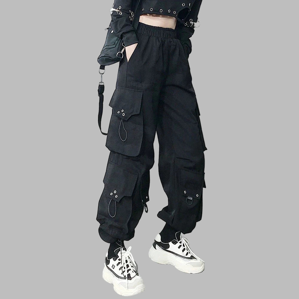 Čierne taktické punkové nohavice s vreckami a reťazami, grunge štýl
