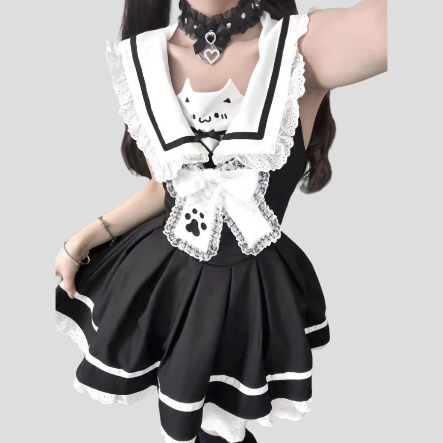 Čierno-biely Jirai Kei kostým slúžky s kawaii zásterou