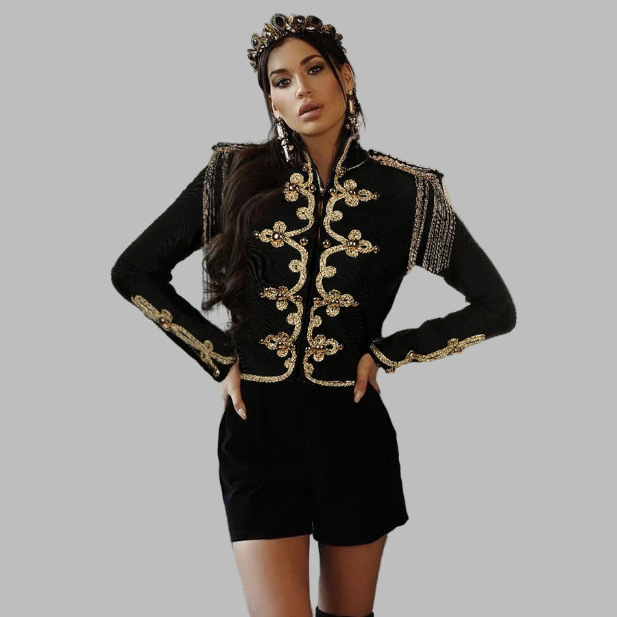 Dámske čierne vojenské sako so zlatou výšivkou, vintage steampunk