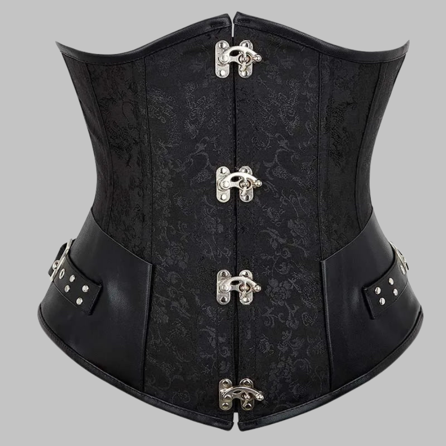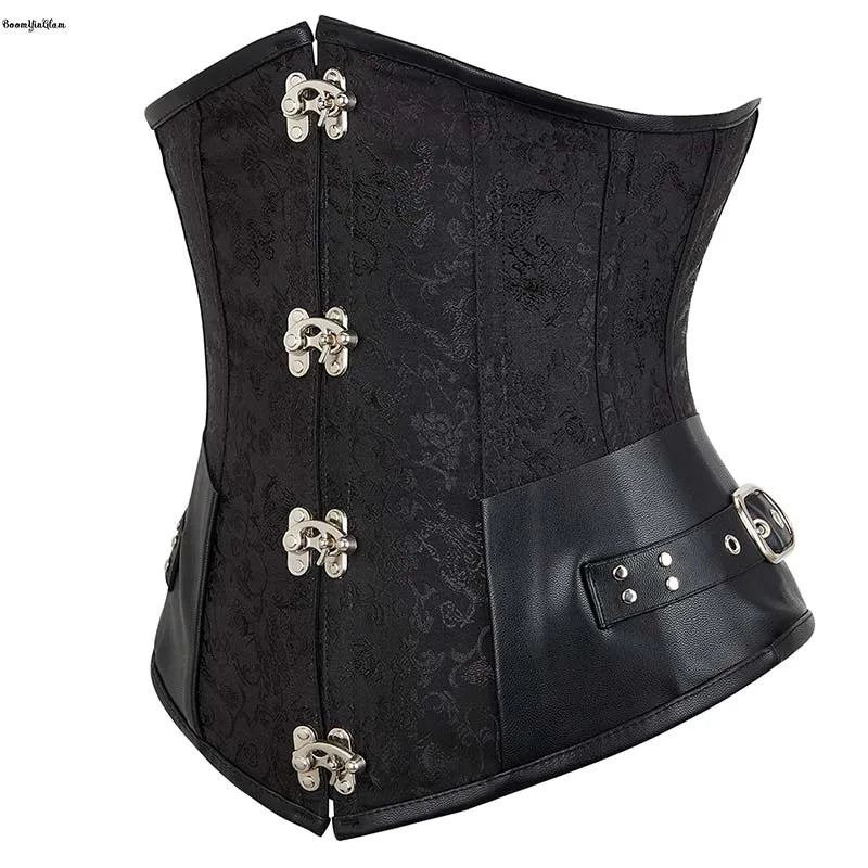 Tento steampunk korzet pod prsia s výrazným dizajnom dokonale formuje postavu s charakterom. Vybavený 12 oceľovými výstuhami poskytuje silnú oporu a efekt zoštíhlenia pása. Ideálny na podujatia, večerné výjazdy, cosplay alebo ako výrazný prvok každodenného štýlu. V sade sú tangá v zodpovedajúcej farbe.