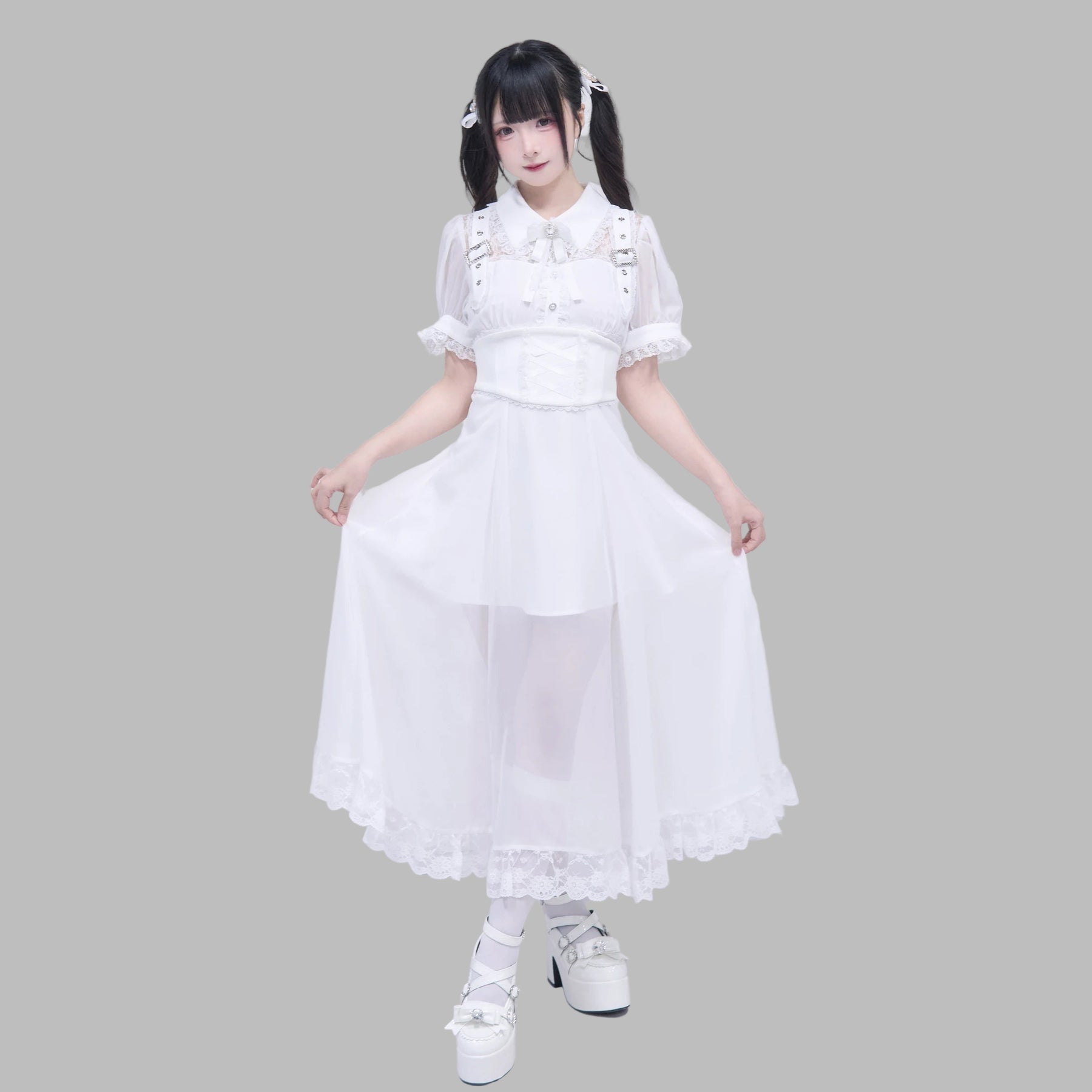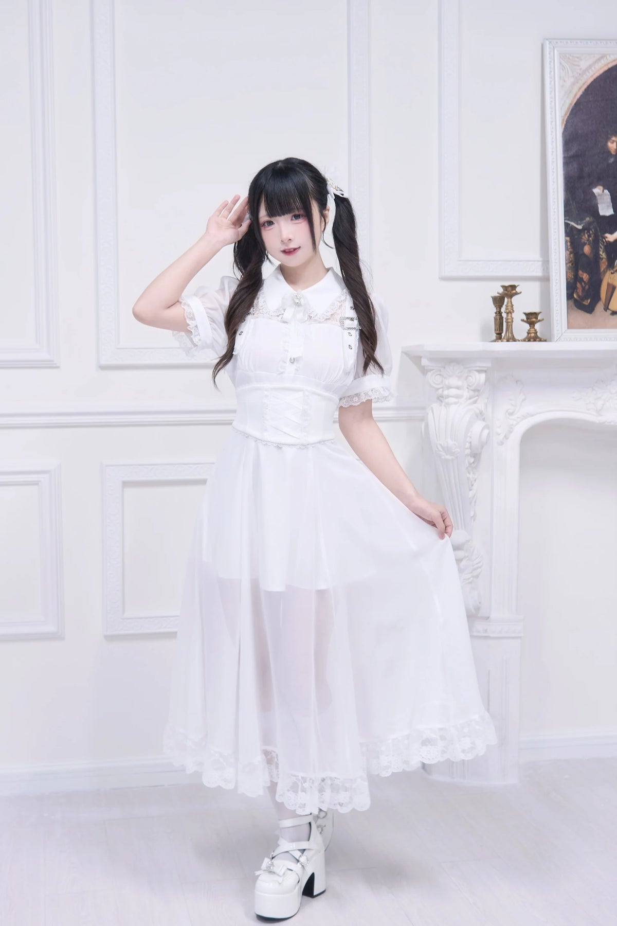 Dlhé biele šaty Jirai Kei s volánmi, kawaii