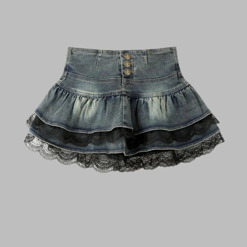 Džínsová volánová sukňa s čiernou čipkou punk rock štýl