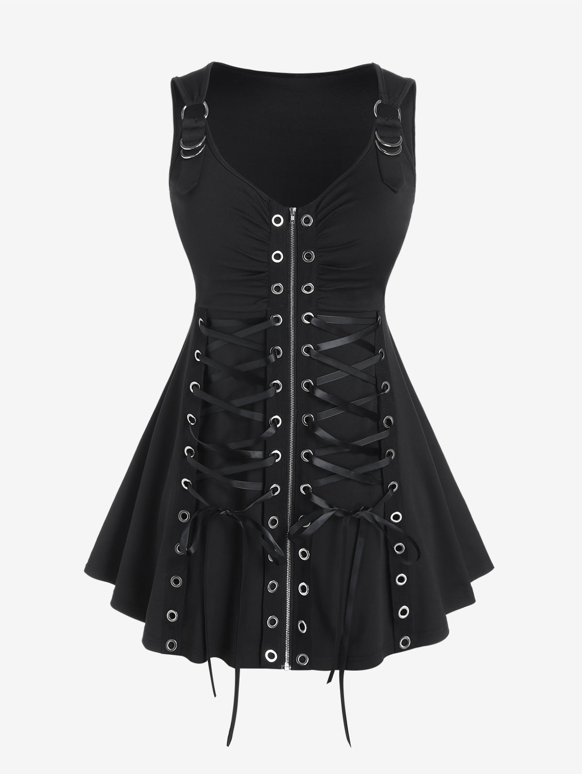 • Rafinované detaily: Celoplošná zipsová chlopňa a starostlivé vypracovanie dodávajú týmto gotickým šatám nádych rafinovanosti, zatiaľ čo ozdobený opasok s prackou prináša štipku originality.