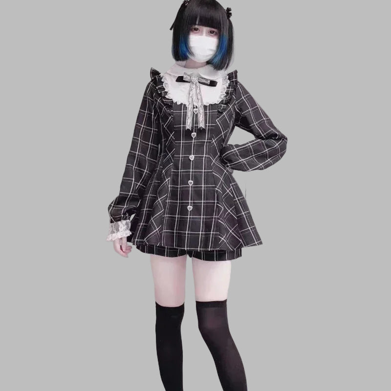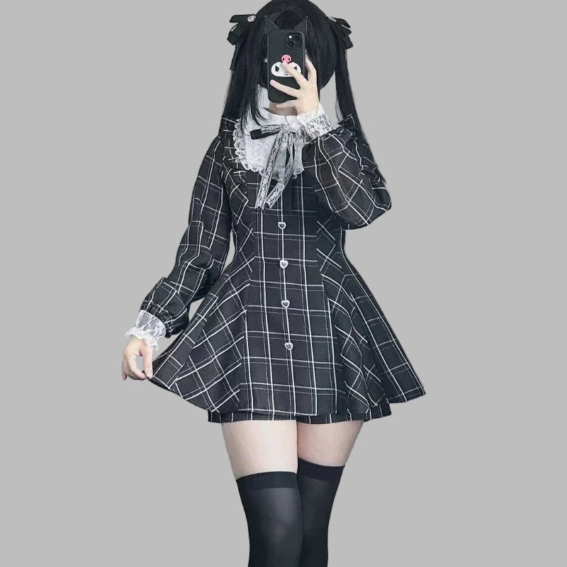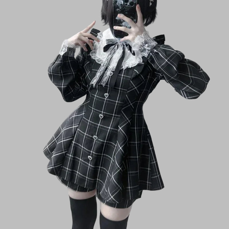 Čierne gotické šaty Lolita s károvaným vzorom a čipkou