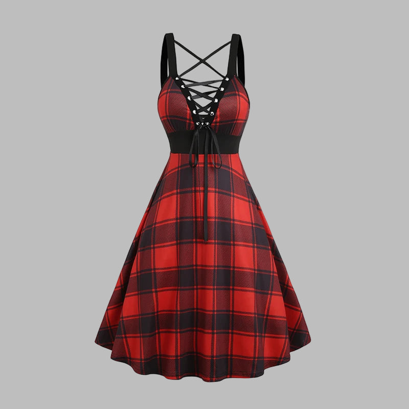 Grunge punk kárované šaty so šnurovaním na chrbte
