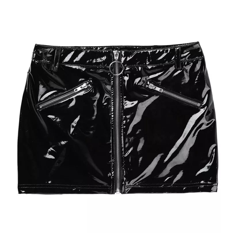 • Lesklý Lakovaný Kožený Materiál: Lesklý lakovaný kožený materiál dodáva tejto sukni štipku glamouru a tajomstva, čím vytvára príťažlivý a hypnotizujúci vzhľad.