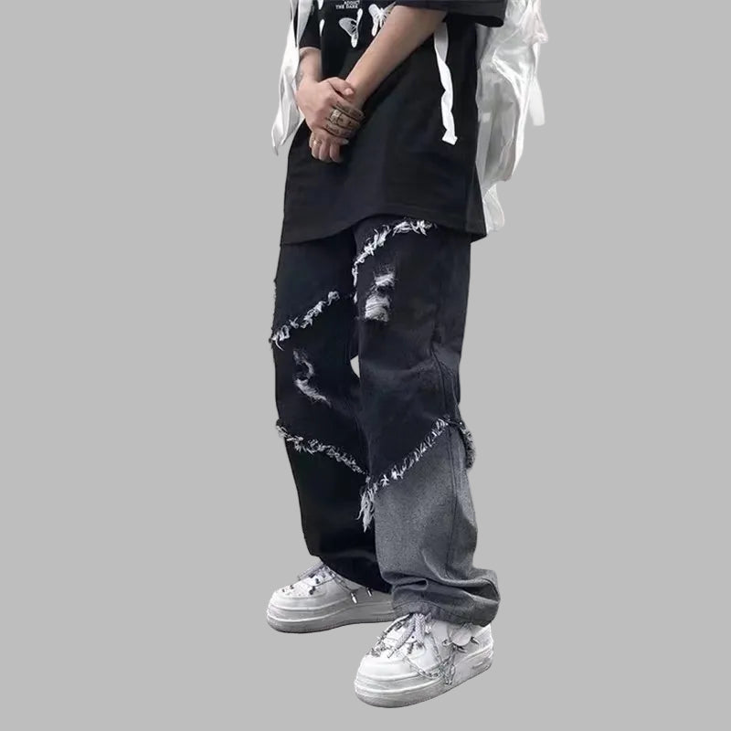 Pánske roztrhané grunge džínsy s potlačou motýľov v čiernej a sivej farbe