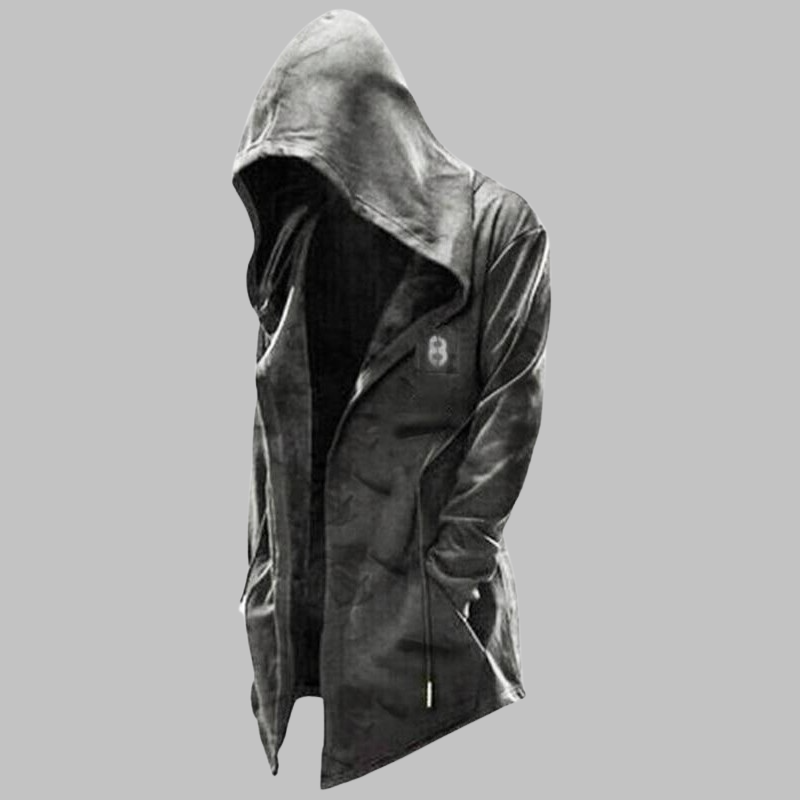 Pánsky gotický plášť s kapucňou – dlhý čierny kabát