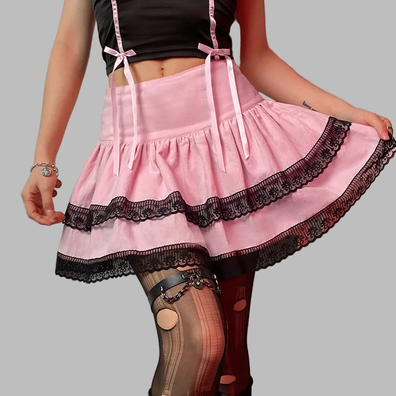 Ružová punk jirai kei sukňa s čiernou čipkou a volánmi
