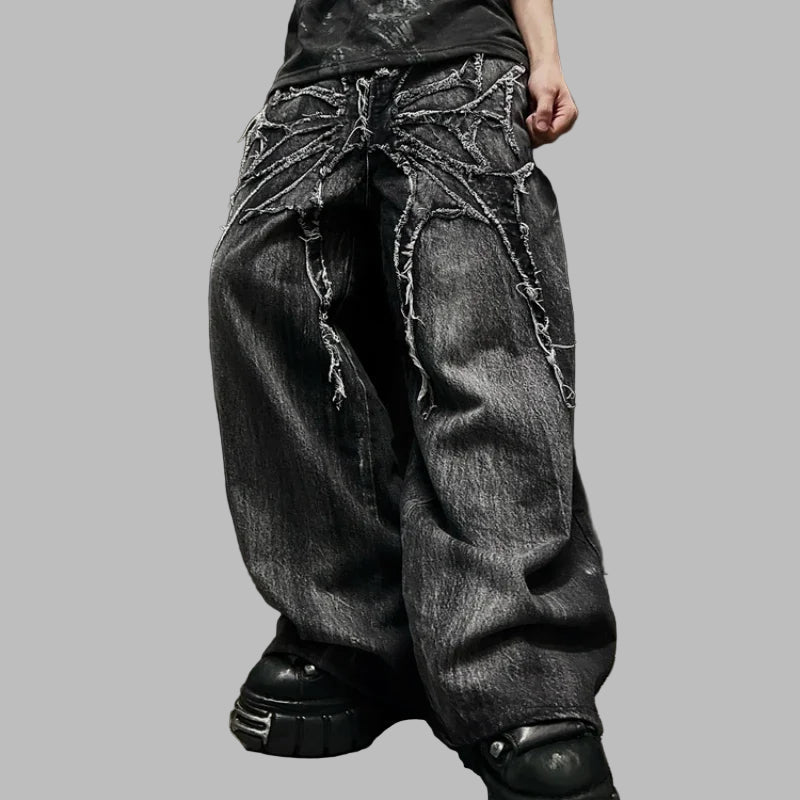 Šedé roztrhané baggy džínsy s reťazami punk metal unisex