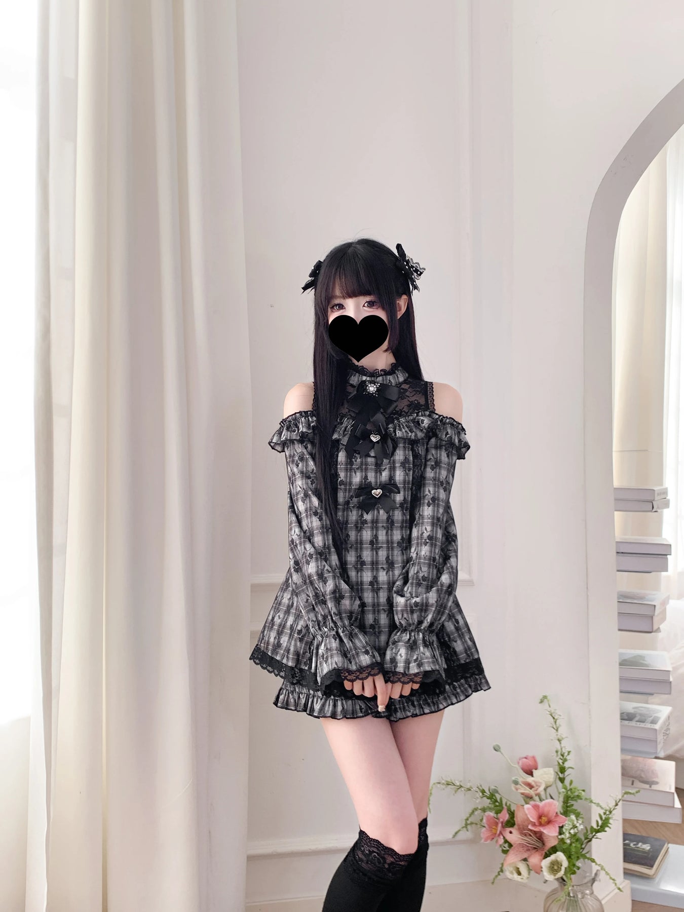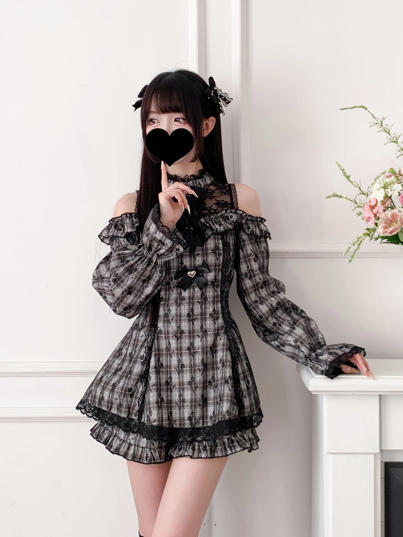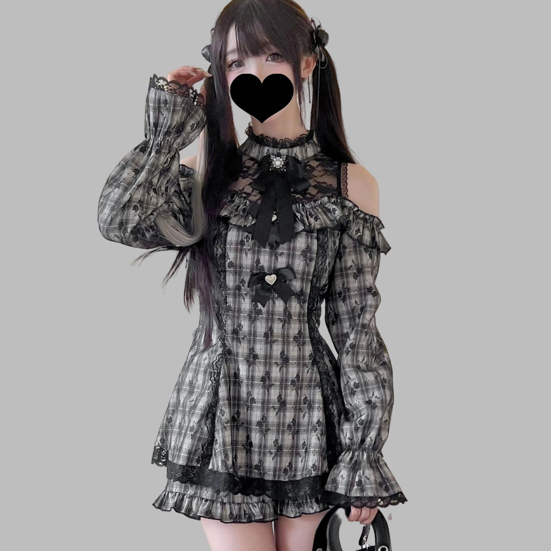 Sivé kárované šaty Jirai Kei s čipkou a odhalenými ramenami Zobraziť možnosti