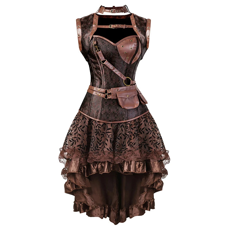 Steampunk šaty s hnedým korzetom a asymetrickou sukňou 6XL
