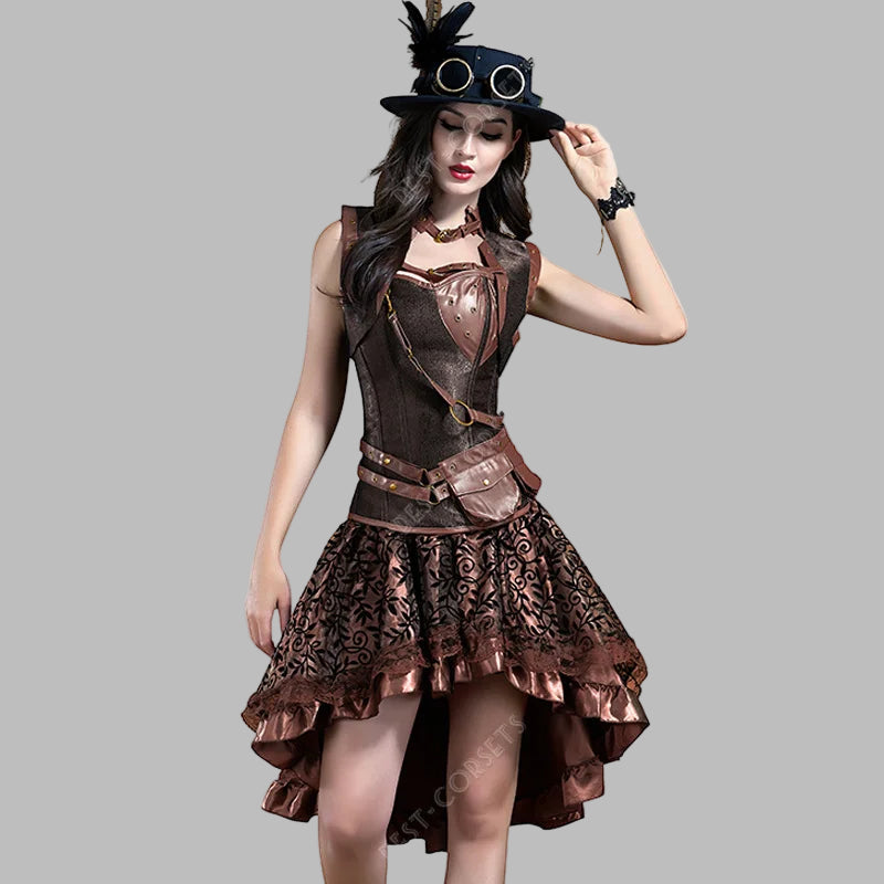 Steampunk šaty s hnedým korzetom a asymetrickou sukňou