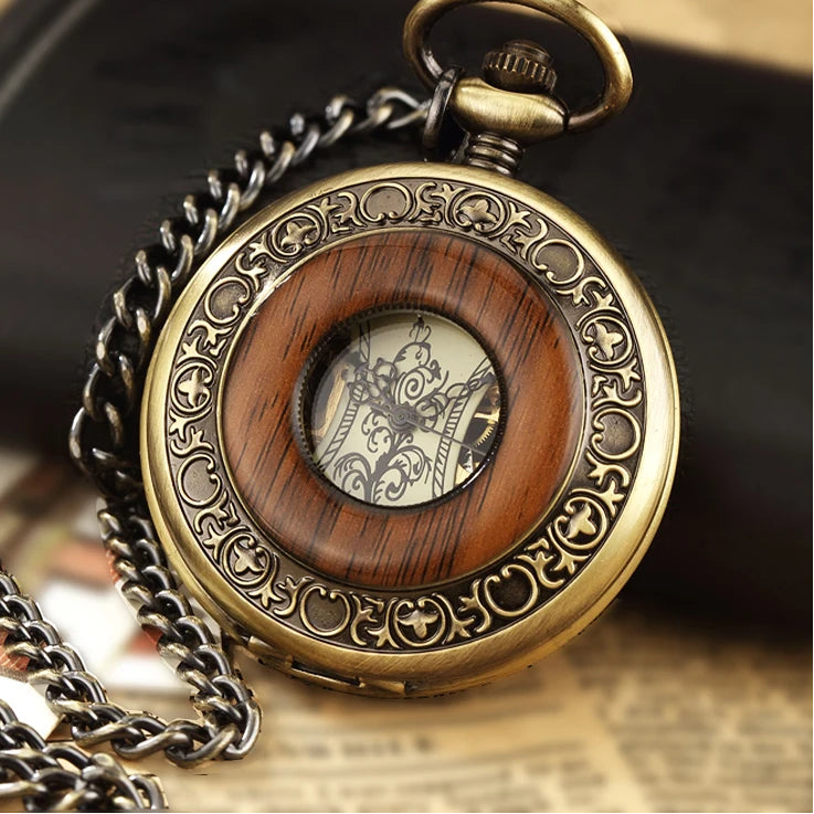 Steampunk vreckové hodinky s drevenou vložkou, hnedé